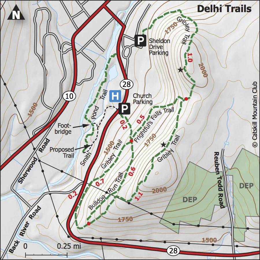 The Delhi Trails are a system of four trails on Mt. Crawford in the Village of Delhi. Built and maintained by the Catskill Mountain Club, The trails, two named for characters in the novel My Side of the Mountain by Jean Craighead George and one in honor of the Delaware Academy mascot Bulldogs, together cover about 5.4 miles and offer the option of shorter hikes of varying degrees of difficulty. The longer Gribley Trail crosses the mountain ridge above the village in three miles. The Bulldog Run can be combined with a section of the Gribley to create a loop hike. The Frightful Falls Trail is a short connector, the steepness of which makes its name seem appropriate. And the Smith Pond Trail sits in the river valley on the west side of SR 28.